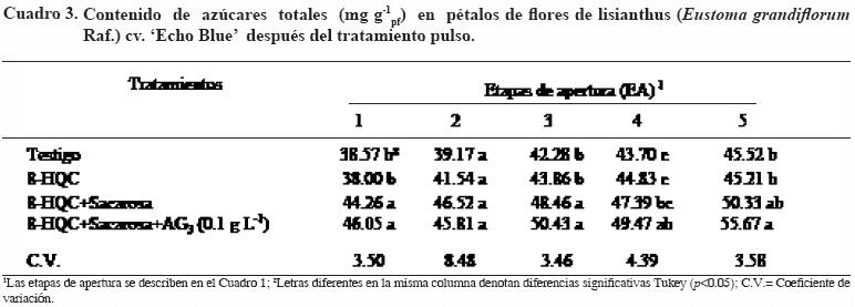 El contenido de azúcares totales fue diferente (p<0.05) donde los tratamientos que incluyeron sacarosa con y sin AG3acumularon entre 14 y 19% en la EA 1, entre 15 y 19% en la EA 2, de 14 a 19% en la EA 3, entre 8 y 13% en la EA 4 y de 10.5 al 22% para la EA 5. Se infiere que el AG3 no influyó en el contenido de azúcares (Cuadro 3).