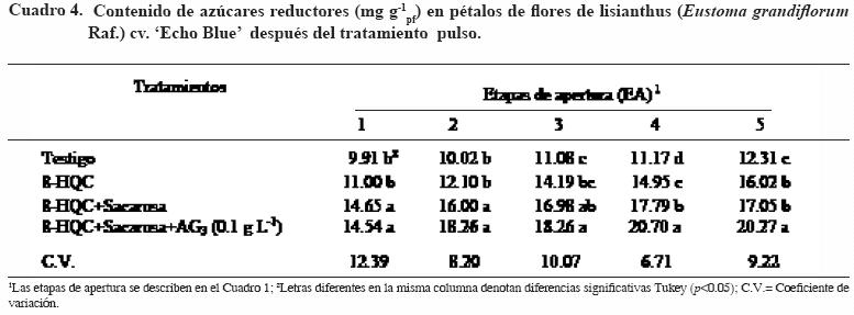 Con respecto a la concentración de azúcares reductores en los botones de las diferentes EA, los tratamientos con sacarosa presentaron una concentración entre 38 y 85% superior al testigo (Cuadro 4). Así mismo, se presentaron diferencias significativas en el tratamiento con AG3 (0.1 g L1) con un incremento del 16% en las EA 4, del 18% en la EA 5 con respecto al tratamiento 8HQC y 8HQC + Sacarosa.