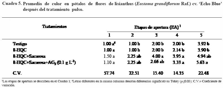 De acuerdo con la escala de color establecida, los cambios más evidentes en el color de las flores se presentaron entre las EA 4 y 5 en todos los tratamientos (Cuadro 5), a excepción del tratamiento con 8HQC + Sacarosa, en donde el cambio más importante ocurrió entre las EA 2 y 3.
