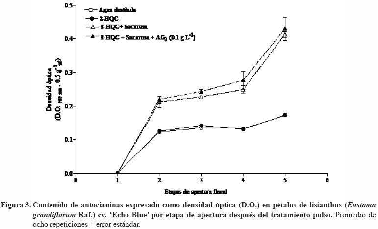 La acumulación de antocianinas se observó, principalmente entre las EA 1 a 2 y de la 4 a la 5 para todos los tratamientos. El incremento en la D.O. fue mayor en los tratamientos que incluyeron sacarosa, con y sin AG3. Así los valores fueron superiores en 73% para la EA 2, 64% para la EA 3, 89% para la EA 4 y 135% para la EA 5 con respecto al testigo. Estos valores se consideraron tomando como referencia de 100% al valor del tratamiento 1 en todas las etapas de apertura. La presencia de AG3 no indujo un incremento significativo en el contenido de antocianinas; la sola presencia de 8HQC tampoco favoreció esta variable. Por lo tanto, el mayor efecto en la acumulación de antocianinas se obtuvo con sacarosa. Las flores de E. grandiflorum cv. 'Asuka no Asa' y 'Asuka no Kurenai' tratadas con solución de sacarosa mostraron un incremento significativo en el contenido de antocianinas (1530%, respectivamente), y del 60% en flores de Lilium sp cv. 'Stargazer' (JamalUddin et al., 2001; Han, 2003).