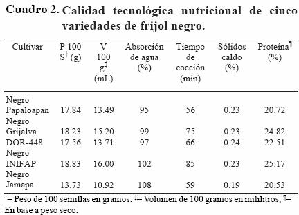 La calidad tecnológica nutricional de Negro Papaloapan es aceptable, grano con capacidad de absorción de agua de aproximadamente del doble de su peso después de 18 h de remojo; por ello se infiere que no presenta problemas de dureza de la testa. Aunque Negro Papaloapan y Negro Jamapa tuvieron los contenidos de proteína más bajos, presentaron menor tiempo de cocción que las variedades Negro INIFAP y Negro Grijalva y la línea DOR 448 (Cuadro 2).