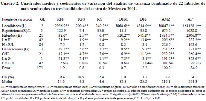 El análisis de varianza combinado mostró diferencias altamente significativas (p<0.01) para todas las características medidas y todas las fuentes de variación, con excepción de la interacción localidad x generación/híbrido (Cuadro 2).