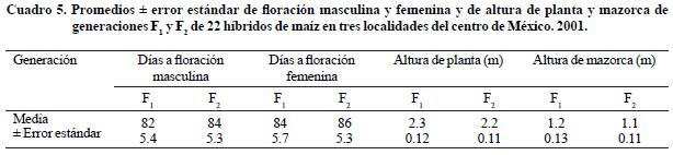 Los híbridos que mostraron alta disminución promedio en rendimiento de grano y forraje seco fueron: Fuego, AS820, Halcón y Z60 y el de menor efecto negativo, SB302 (Cuadro 4). El avance generacional no afectó significativamente los días a floración femenina y masculina ni redujo la altura de planta y mazorca y los valores del error estándar de todas las variables se redujeron en F2 (Cuadro 5).