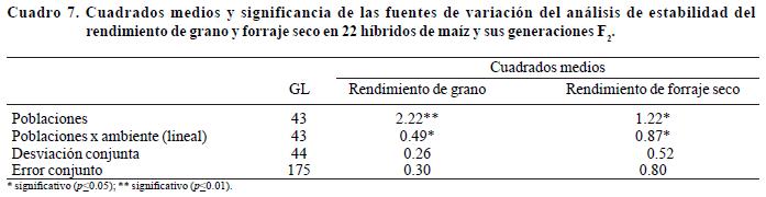 El análisis de la estabilidad del rendimiento de grano y forraje seco mostró diferencias altamente significativa entre híbridos F1 y generaciones F2 y en la interacción híbridos x ambientes lineal (Cuadro 7), lo que indica que la respuesta de los híbridos fue diferente en cada ambiente de prueba. No obstante, todos los híbridos fueron clasificados como estables, tanto en F1 como en F2 (bi= 1; S2di= 0), para producción de grano y de forraje seco, con excepción de Z60 (F1) que mostró buena respuesta en todos los ambientes pero en forma inconsistente para rendimiento de forraje seco y C922 (F2) con mejor respuesta en ambientes desfavorables y consistente para producción de grano, respectivamente. El avance generacional no afectó la estabilidad del rendimiento de grano y forraje seco. Mejía y Molina (2003) señalan que en las poblaciones mejoradas se incrementa la frecuencia de alelos favorables en cada locus, lo que les permite tomar ventaja cuando existen condiciones ambientales favorables.
