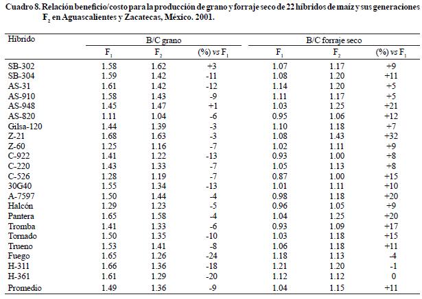 El análisis de la relación B/C de la producción de grano y forraje seco en los híbridos y sus generaciones avanzadas mostraron 9% de reducción de rendimiento de grano en promedio y 11% de incremento en rendimiento de forraje seco en la generación F2. Los híbridos SB302 y AS948 fueron los únicos que no mostraron reducción en la relación B/C en producción de grano. En la producción de forraje seco los híbridos Z21, AS948, A7597 y Pantera mostraron las más altas relaciones B/C (Cuadro 8). Coutiño et al. (2004) reportaron reducción en la utilidad neta con el uso de semilla F2 de 14 híbridos de maíz cultivados en Chiapas, México. La relación B/C del híbrido más productivo en Chiapas fue 1.67 en F1 y 1.34 en F2, similares a los reportados en esta investigación. Los resultados demuestran que no obstante la baja productividad de grano y forraje seco en la región de estudio, la rentabilidad del cultivo de maíz de doble propósito no fue fuertemente afectada con el uso de semilla F2, particularmente, en la producción de forraje seco. Para las condiciones estudiadas, los híbridos SB302 y AS948; así como, sus generaciones avanzadas mostraron el menor efecto por avance de generación en comparación con los otros, lo que se reflejó en el rendimiento de grano y forraje y en la relación B/C. Ambos híbridos constituyen una opción viable en la producción de maíz de doble propósito en la región de estudio.