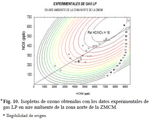 4. La isopleta experimental (Fig. 10) construida con todos los datos obtenidos en cada cámara con y sin adición de gas licuado, permite concluir que en la mayoría de los días en que se realizaron los experimentos (representados por un circulo), la atmósfera se encontraba en una región ligeramente saturada de Hidrocarburos. De manera que dependiendo de las concentraciones iniciales de HC y NOx del día, si aumentan las emisiones de gas LP, el efecto sobre ozono es poco o en su caso presenta inhibición.
