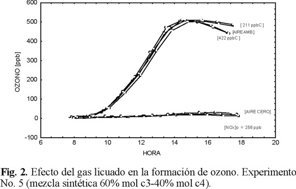 Los experimentos que se realizaron con aire ambiente sirvieron para conocer la respuesta del máximo de ozono para diferentes formulaciones y concentraciones de precursores de ozono. Las pruebas con aire ultracero tuvieron como objetivo determinar la reactividad de 3 formulaciones de gas licuado.