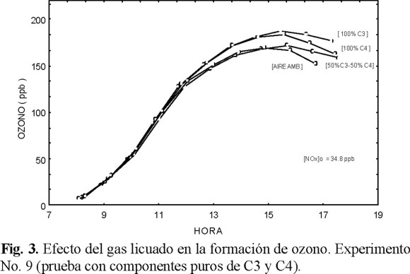 1. De todas las formulaciones que se probaron, la formulación comercial de gas licuado fue la única que presentó una influencia definida como promotor de la formación de ozono (Fig. 7). Aunque ésta no muestra ser determinante como los afirmó Blake y Rowland [1], ya que sólo representó en promedio un 2.4% de incremento de ozono (dato libre de las variaciones del sistema experimental). Esta diferencia se debe a que el efecto sobre la formación de ozono no se puede predecir con exactitud si no se cuenta con índices de reactividad determinadas a las condiciones de la Ciudad de México.
