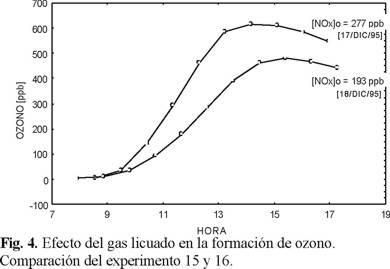 En la figura 4 se indica la comparación de 2 experimentos (del día 15 y 16) sobre el máximo de ozono formado. El experimento del día 15 tiene un valor para los NOx iniciales (óxidos de nitrógeno totales al llenar las bolsas por la mañana o preparar el experimento) de 277 ppb y el valor de ozono alcanzado es de 615 ppb, en cambio, para el experimento del día 16, el valor de ozono es de 480 ppb y los NOx iniciales son de 193 ppb, lo que muestra que la influencia de los NOx iniciales toman parte importante en la formación de Ozono par condiciones similares de temperaturas y radiación de acuerdo a las figuras 5 y 6.