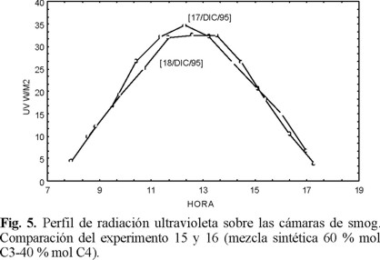 La figura 5 presenta el perfil de la radiación ultravioleta durante el día para los experimentos de los días 15 y 16, que corresponden a la formulación 60 % C3 (propano)-40 % C4 (butano). El perfil de radiación para ambos días fue similar, alcanzando un valor máximo de radiación alrededor de las 13:00 h.