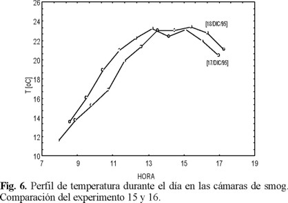 La figura 6 muestra el perfil de temperatura dentro de la cámara 9 durante los trabajos del día 15 y 16; en ambos días se presenta una tendencia muy similar y el valor máximo de temperatura se alcanza alrededor de las 15:00 h en los 2 experimentos.