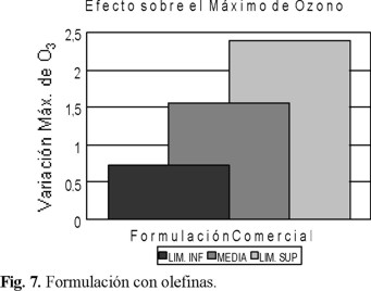 La figura 7 muestra el porcentaje de variación del máximo de ozono con respecto a la cámara sin adición de las formulaciones comerciales evaluadas experimentalmente, que fueron las únicas que presentaron una tendencia definida.