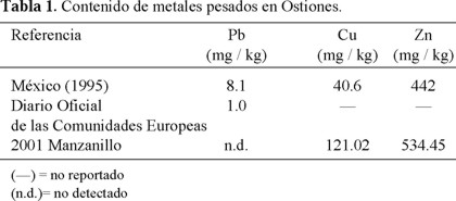 Los resultados obtenidos en el presente estudio muestran que en estos organismos la concentración de Pb está por debajo del límite de detección de la técnica analítica utilizada. El límite máximo permisible (LMP) para moluscos bivalvos es de 1 mg / kg según Diario oficial de las Comunidades Europeas [5]; el resultado obtenido está de acuerdo con la teoría de que los ostiones no acumulan los elementos no esenciales, en especial el Pb, según otros resultados obtenidos en estudios realizados [6] (WHO, 1971), no obstante en México, se reportaron valores de hasta 8.1 mg / kg. [7].