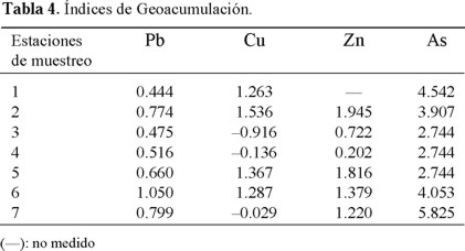 El Igeo alcanza valores de 0 a 6, el valor 0 indica ausencia total de contaminación y el valor 6 indica contaminación máxima (Cn 100 Bn). En la Tabla 4 se muestran los resultados obtenidos para los distintos puntos muestreados. Como puede observarse los resultados para el Pb, Cu, y Zn muestran que la zona de estudio no presenta un nivel de contaminación importante ya que todos los resultados están comprendidos entre 0 y 1. En el caso del As, la concentración de este elemento en las estaciones 1, 2, 6 y 7 muestran un alto grado de contaminación según este índice.