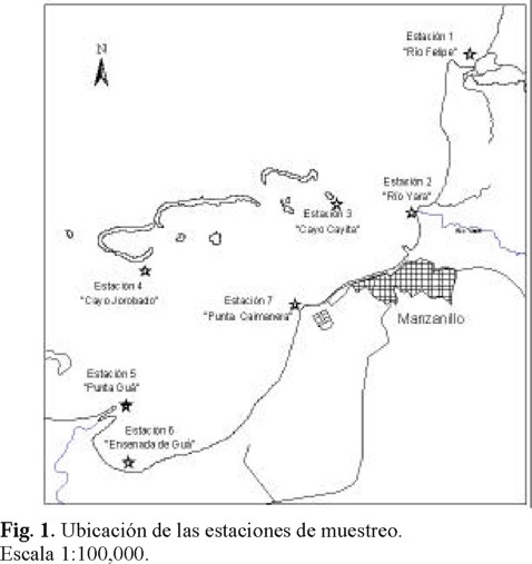 En la zona investigada fueron situadas siete estaciones de muestreo, donde se colectaron muestras de sedimentos de fondo y organismos (Fig. 1).