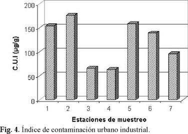 En la Fig. 4 se muestra el resultado de la distribución espacial del índice de contaminación urbano industrial para las diferentes estaciones de muestreo, se observa que la zona de los cayos (estaciones 3 y 4) presenta un menor índice de contaminación en tanto que las desembocaduras de los ríos: Felipe (estación 1), Yara (estación 2), y Guá (estación 5) así como la ensenada del Guá (estación 6) presentan los valores más elevados.
