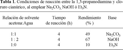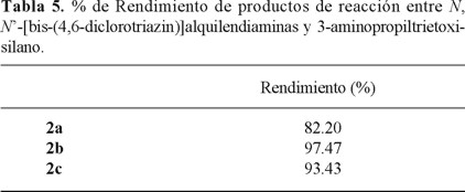 Al evaluar la 1,6-hexanodiamina, empleando hidróxido de sodio y una relación de acetona:agua de 1:2, se obtiene un rendimiento del 66% luego de 21 h de reacción; sin embargo, al prolongar el tiempo de reacción hasta 64 h, el rendimiento disminuye (50%) debido a que se presenta la oxidación de los cloruros remanentes en el anillo de la triazina (Tabla 3), lo cual indica que aún controlando la cantidad de agua, los tiempos prolongados de reacción propician la hidrólisis de los cloruros en el producto.