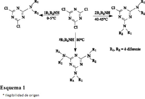 Dentro de las diferentes opciones para modificar químicamente al PVC las aminotriazinas se han empleado como agentes de entrecruzamiento. Los derivados de triazina empleados para tal aplicación han sido sintetizados a partir de cloruro cianúrico aprovechando la diferencia en reactividad de los cloros en el anillo de la s-triazina, dicha diferencia depende de la naturaleza de los reactivos nucleofílicos y del número y naturaleza de los sustituyentes en el anillo, así como de la temperatura de la reacción. Manipulando las condiciones de reacción se pueden obtener derivados mono-, di-, o tri-sustituidos [1] tal como se muestra en el Esquema 1.