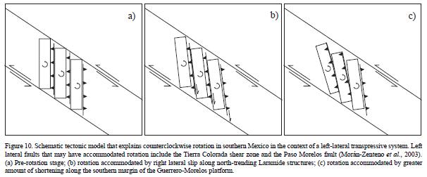 Left lateral strikeslip motion has been proposed for several northwest to westnorthwest trending structures in southern Mexico (e.g., Meschede et al., 1997; Martiny et al., 2000; AlanizÁlvarez et al, 2002; NietoSamaniego et al, 2005), thus the geometries required to explain counterclockwise rotation can be tested against available paleomagnetic data. A possible mechanism linked to transpression is illustrated in Figure 10; here, sampling sites in southern Mexico are framed within a broad left lateral shear system (Figure 10a), and Laramide structures that trend northsouth are required to accommodate a small right lateral component in order to explain counterclockwise rotation (Figure 10b). Rightlateral faults have been reported by NietoSamaniego et al. (2005) in the northeast portion of the GuerreroMorelos platform, and we observed similar structures, yet small, affecting the Amacuzac section. Alternatively, a greater amount of shortening must be accommodated by the thrust faults in the southern part of the rotated domain (Figure 10c). Greater amount of shortening in the southern part of the platform is rather evident (CercaMartínez, personal communication 2005).