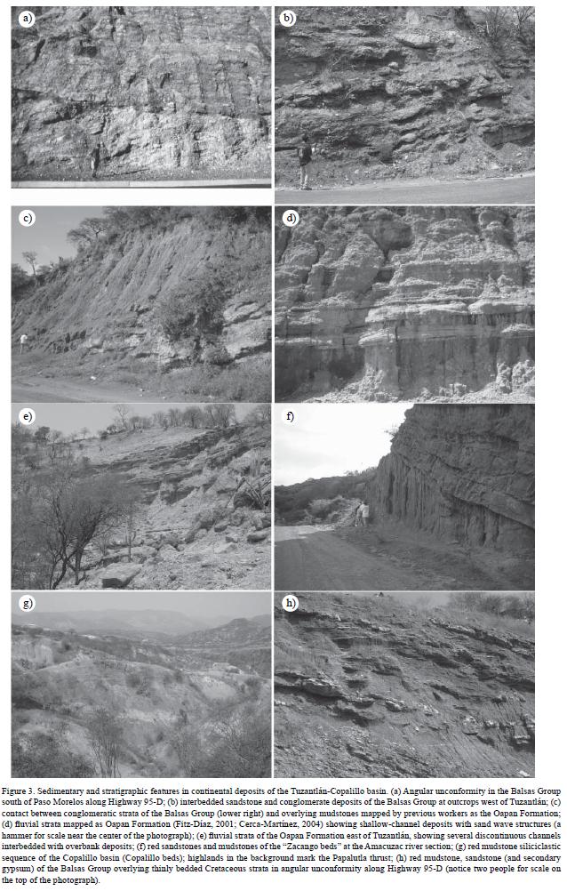DávilaAlcocer (1974), FitzDiaz (2001), and CercaMartínez (2004) have identified and mapped basins where Cenozoic strata accumulated in the region between Paso Morelos and Copalillo, in northeastern Guerrero (Figure 1). The Copalillo basin (CercaMartínez et al, 2004), the most eastward of the basins, is bordered to the east by the Papalutla fault and by uplifted metamorphic rocks of the Acatlán complex (Figure 1). The Tuzantlánbasin is bordered to the west by a domal structure characterized by thick exposures of carbonate rocks of the Morelos Formation (Figure 1). Outcrops of Oligocene volcanic rocks poorly define the northern margins of the basins, and the basins are connected to the south with the upper BalsasMezcala river basin. It is evident that after deposition of the Cenozoic sequences, the basins were modified by normal, reverse, and strikeslip faulting. A facies reconstruction presented below suggests that during deposition of the Balsas Group the basins behave as a single basin, with sediment sources to the west and a depocenter near the town of Copalillo. We thus refer collectively to these basins as the TuzantlánCopalillo basin, whilst FitzDiaz (2001) referred to it as the Zacango synclinorium.