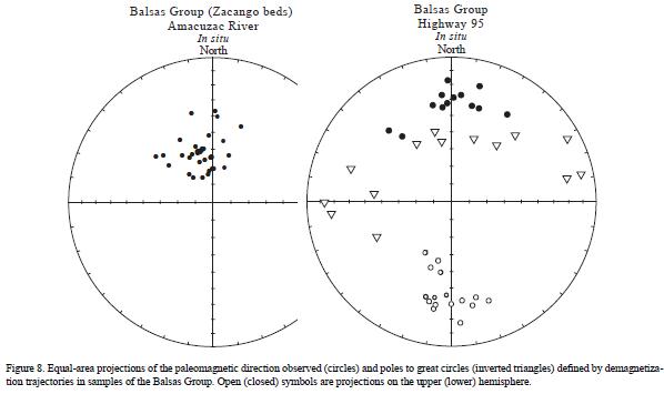 When compared with the expected field direction of D=354.7° and 1=32.8°, the Balsas mean at the highway section is concordant. In contrast, the Amacuzac section indicates a small counterclockwise rotation (13.2° ± 8°), evident by declinations to the northwest and insignificant inclination anomaly (1.5° ± 9°). The rotation occurred in the Oligocene or at a later time.