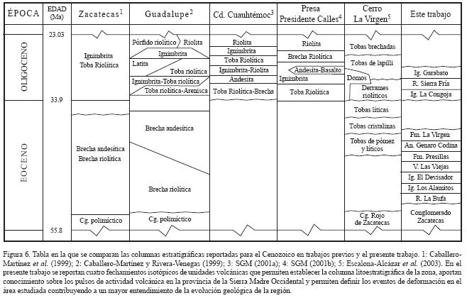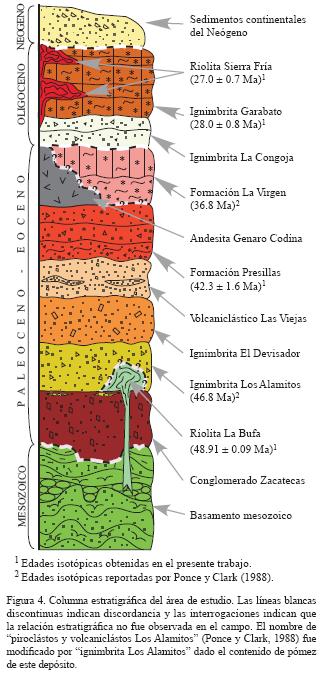 La geología de la región comprende rocas cuya edad va desde el Triásico hasta el Neógeno. El Triásico está representado por rocas sedimentarias clásticas con bajo grado de metamorfismo a las cuales sobreyacen lavas andesíticobasálticas y rocas volcaniclásticas del Cretácico (CentenoGarcía y SilvaRomo, 1997). Yta et al. (2003) reportaron la presencia de cuerpos intrusivos de composición básica al oeste de Zacatecas que afectan a las unidades triásicas y cretácicas. Las rocas mesozoicas están sobreyacidas discordantemente por conglomerados y areniscas continentales del PaleocenoEoceno inferior, culminando la secuencia estratigráfica con una cubierta volcánica principalmente de composición riolítica (Figura 3).