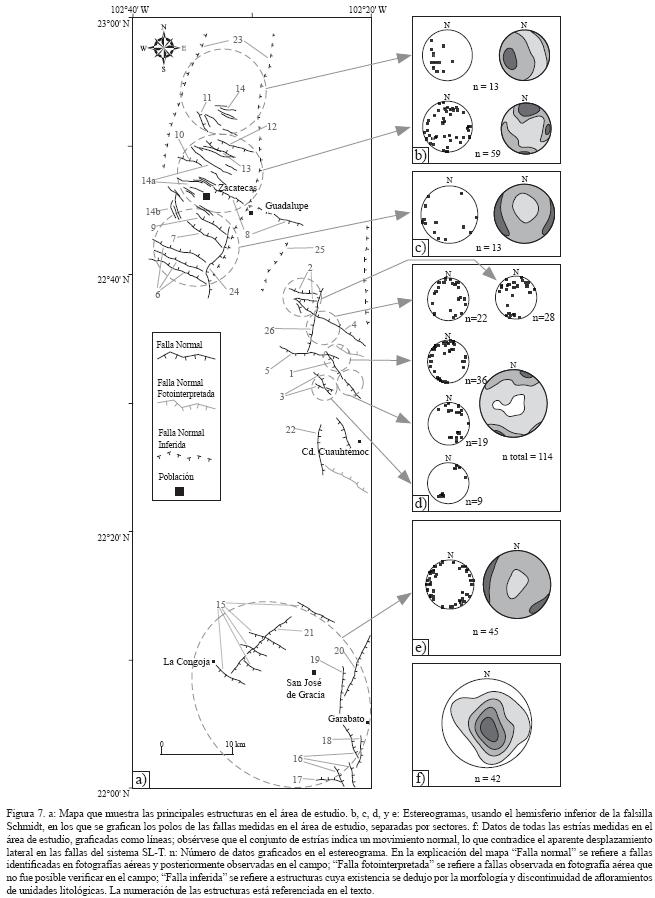 En la zona de estudio es muy clara la distribución de las estructuras pertenecientes al SLT y al GA (Figura 7). Así, en la zona norte (Figuras 7b y 7c) y en la porción sur del área de estudio (Figura 7e) predominan las estructuras de rumbo NNENNW, buzantes tanto al Este como al Oeste, pertenecientes al graben de Aguascalientes. Mientras que en la porción central de la zona de estudio predominan las estructuras pertenecientes al Sistema de Fallas San Luis Tepehuanes (Figura 7d). En las estructuras que fue posible medir estrías se encontró que estas presentan movimientos mayoritariamente normales (Figura 7f).