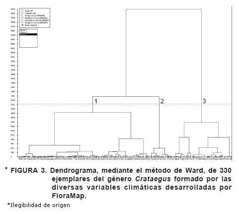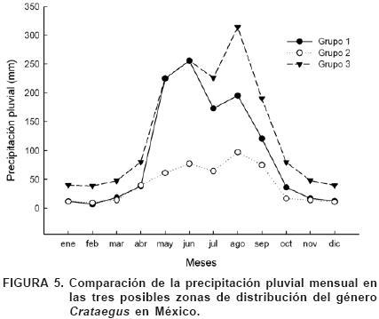 El AA definió tres grupos climáticos; el primer grupo incluyó 205 puntos, presentando una elevación sobre el nivel del mar promedio de 2,360 m; el segundo incluyó 34 puntos con una elevación sobre el nivel del mar promedio de 1,477.8 m; y finalmente el grupo 3 que presentó 91 puntos y una elevación sobre el nivel del mar promedio de 1,402.1 (Figura 3). Presentando perfiles climáticos diferentes (Figura 4), por lo que se sospecha tres posibles centros de distribución del género Crataegus en México.
