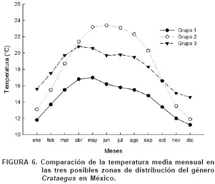 Al parecer el grupo 1 podría asociarse a la distribución de C. mexicana Moc & Sessé principalmente y también, pero en menor medida, a C. gracilior Phipps (Phipps, 1997); éste es el grupo climatológico de interés para la realización de colectas para obtener germoplasma superior desde un punto de vista frutícola, debido a que estas especies son las utilizadas para dicho fin (Nieto–Ángel et al., 1997). Y debido a los problemas reproductivos reportados para el género, como diferentes niveles de ploidía (2x, 3x, 4x, 5x, y 6x; con x=17; Talent y Dickinson, 2005), agamospermia estéril masculina, hibridismo (Grant, 1989), apomixis (Muniyamma y Phipps, 1979; Talent y Dickinson, 2007) así como pseudogamia, y autoincompatibilidad gametofítica (como en el caso de la manzana) (Phipps et al., 2003), no es conveniente hacer hibridaciones con otras especies.