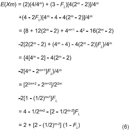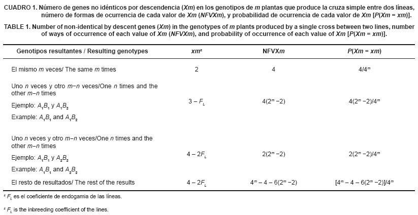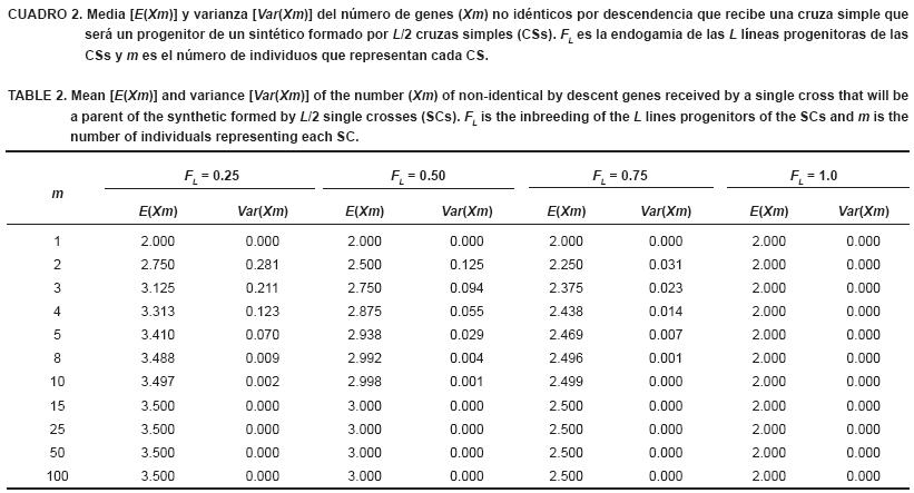 Si el coeficiente de endogamia de las L líneas con que se genera las L/2 cruzas simples (CS) es menor que 1 (FL < 1), y cada CS se representa por más de 1 planta (m > 1), en los m genotipos de las m plantas de cada cruza simple debe haber de 2 a 4 genes no idénticos por descendencia (NIPD). Según la Ecuación 6, el número esperado de genes NIPD [E(Xm)] que tiene una cruza simple es 2 + [2 - (1/2)m-2](1 - FL) . Esta expresión implica que E(Xm) aumenta cuando m es mayor. Esto se debe a que cada gen adicional que contribuye a la formación de un genotipo de una cruza simple es una oportunidad de que sea un gen NIPD que no se hubiera contribuido previamente. Sin embargo, de acuerdo con la Ecuación 6, estos incrementos del número de genes NIPD aportados son cada vez más pequeños. El Cuadro 2 refleja claramente esta tendencia. En el extremo opuesto, cuando cada cruza simple se representa por una planta (m = 1) su genotipo siempre tiene que estar formado por 2 genes NIPD debido a que las líneas no están emparentadas; y la media y la varianza del número de genes NIPD deben ser 2 (Ecuación 6) y 0 (Ecuación 12), respectivamente, para cualquier valor de FL (Cuadro 2).