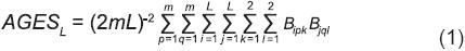Para investigar qué es AGESL (Ecuación 1) en términos del sintético que genera el apareamiento aleatorio de L/2 cruzas simples formadas con la participación de cada una de las L líneas, se consideró que la cruza simple h (h = 2, 4, 6,..., L), representada por m plantas, está formada por las líneas h y h−1. El arreglo genotípico de la población que producen las L/2 cruzas (AGESCS) es de la forma: