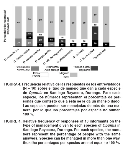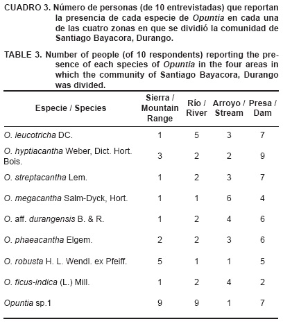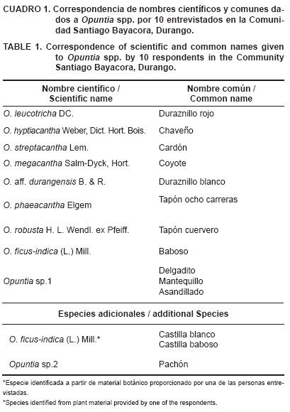 Las diez personas entrevistadas reconocieron las nueve especies de nopales mostradas en las fotografías como "duraznillo rojo" (O. leucotricha), "chaveño" (O. hyptiacantha), "cardón" (O. streptacantha), "coyote" (O. megacantha), "duraznillo blanco" (O. aff. durangensis), "tapón ocho carreras" (O. phaeacantha), "tapón cuervero" (O. robusta), "baboso" (O. ficus-indica) y "mantequillo/delgadito/asandillado" (Opuntia sp.1) (Cuadro 1). Los entrevistados mencionaron otras dos especies conocidas por ellos y no incluidas en el catálogo, las cuales nombraron como "Castilla blanco" (O. ficus-indica) y "Pachón" (Opuntia sp2). Esta última, reportaron, no la han visto de manera silvestre "desde hace varios años". Los nombres comunes con los que los entrevistados identificaron las especies mostradas en las imágenes tuvieron una correspondencia uno a uno con respecto a su nombre científico, excepto Opuntia sp.1, para la cual se dieron tres nombres diferentes (mantequillo, delgadito y asandillado) y Opuntiaficus-indica a la que se conoce por dos nombres (baboso y castilla blanco) (Cuadro 1).