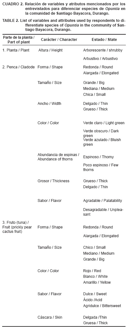 Para Opuntia phaeacantha, O. leucotricha y Opuntia sp.1, sólo se obtuvo un consenso del 50 % de los entrevistados respecto a sus respuestas. Así, a O. phaeacantha se le atribuyen como características principales el porte arbustivo de la planta, la abundancia de espinas en pencas y el sabor dulce de sus frutos. Opuntia leucotricha se identifica principalmente por el buen sabor de sus pencas y el tamaño pequeño de sus frutos (carácter diagnóstico en la región). Para Opuntia sp.1 los entrevistados mencionaron tres principales atributos diagnósticos: abundancia de espinas ("espinoso") en pencas, ancho de la penca (delgada) y el porte arbóreo de la planta. En menor medida se recabaron respuestas comunes entre los entrevistados (40 %) para O. hyptiacantha y O. ficus-indica. La primera se pudo reconocer por el tamaño grande de su tuna y su sabor dulce; la segunda, por tener pencas poco espinosas y tunas de color amarillo.