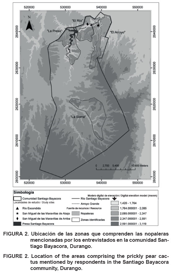 La comunidad de Santiago Bayacora incluye 11 localidades y 1,300 habitantes (Anónimo, 2010). Se ubica aproximadamente a 17 km al sur de la ciudad de Durango, en el municipio del mismo nombre, entre los 23° 30' 27'' y 23° 55' 13'' de latitud Norte y 104° 31' 55'' y 104° 46' 32'' de longitud oeste, a una altitud que varía entre 1900 y 2900 msnm. Con base en cartas de INEGI a escala 1:1,000,000 (Anónimo, 2004), se calculó su superficie en 67,000 ha. A partir de prospecciones preliminares se escogieron las localidades de Río Escondido, San Miguel de Maravillas de Arriba y San Miguel de Maravillas de Abajo para realizar este estudio, ya que sus habitantes dependen en mayor medida del aprovechamiento de las especies de Opuntia.