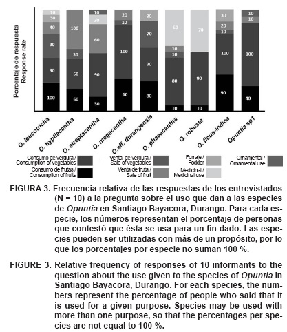 En cuanto a los principales usos que los entrevistados reconocieron de las especies identificadas, resaltó el consumo de fruta (tunas) para las nueve especies; el consumo de verdura (cladodio) para O. leucotricha, O. aff. durangensis, O. hyptiacantha y O. megacantha; la venta de fruta (tuna) de O. hyptiacantha y O. streptacantha, y la venta de verdura (cladodio) de O. leucotricha y O. aff. durangensis. Para uso medicinal destacaron O. phaeacantha y O. robusta. Otras especies son usadas con fines de ornato como O. streptacantha y Opuntia sp.1, mientras que para forraje son utilizadas O. ficus-indica, O. aff. durangensis y O. leucotricha (Figura 3).