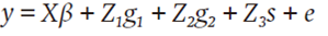 en donde y es un vector p×1 de p rendimientos observados de las N cruzas simples, β es un vector c×1 de efectos fijos de los c ambientes de evaluación, g1 es un vector n 1×1 de efectos aleatorios de aptitud combinatoria general (ACG) de las líneas del grupo X, g 2 es un vector n 2×1 de efectos aleatorios de ACG de las líneas del grupo Y, s es un vector N×1 de los efectos aleatorios de aptitud combinatoria específica (ACE) de las N cruzas simples, e es el vector p×1 de residuos y X, Z 1, Z 2, y Z 3 son matrices cuyos elementos son 0 o 1 para denotar ausencia o presencia de efectos que relacionan a y con β, g 1, g 2 y s, respectivamente.