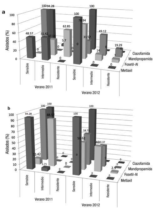 El resto de los productos mostraron inconsistencias en las curvas de avance de la enfermedad en campo de un año a otro. El metalaxil, por ejemplo, permitió una infección de 39 % en un año y de 87 % en el otro. Además, hubo infección casi total en el tratamiento con ciazofamida el primer año y con fosetil-Al el segundo año. Esto también se reflejó en los ensayos in vitro, en los que las poblaciones expuestas a la ciazofamida fueron consistentemente las más susceptibles, sin mostrar resistencia; lo cual sería exactamente lo contrario a lo que se esperaría cuando en el campo este producto no controló a la enfermedad.