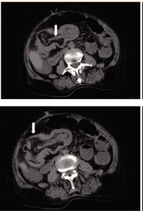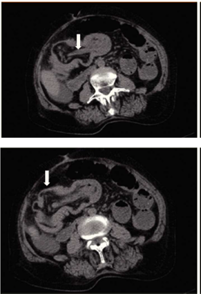 Se trata de paciente femenino de 77 años de edad, con antecedente de hipertensión arterial sistémica, ingresa a nuestro servicio por presentar cuadro doloroso abdominal intenso de una semana de evolución (fig. 1), acompañado de distensión abdominal náusea y vómito, el cual no remitió con la administración de analgésicos, acudió a valoración por facultativo quien solicitó ultrasonograma (USG) abdominal evidenciando la presencia de un tumor en colon derecho, se ingresó a la paciente por presentar persistencia de la sintomatología. A la exploración física hemodinámicamente estable se encontró abdomen distendido, doloroso a la palpación, superficial, media y profunda en cuadrantes abdominales inferiores y ruidos metálicos a la auscultación, con datos de irritación peritoneal. Paraclínicos con leucocitosis leve únicamente. En el USG abdominal reportó en flanco derecho una imagen ecogénica, redondeada, bien delimitada, con medidas de 41 × 38 × 59 mm en sus ejes mayores, la cual a la aplicación de Doppler color no mostró vascularidad, esta zona es aperistáltica, en relación a conglomerado de asas. No se identifica líquido libre. La TAC abdominal (fig. 2) con imágenes compatibles a oclusión intestinal probablemente secundaria a invaginación intestinal a nivel de ciego y colon ascendente, la cual condicionaba ascitis y neumatosis intestinal leve, además de probable adenoma suprarrenal derecho. Con lo anteriormente mencionado se infiere diagnóstico de invaginación intestinal, por lo cual se programa de urgencia para laparotomía exploradora.