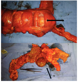 Como sería ideal en todas las patologías de resolución quirúrgica, el procedimiento quirúrgico utilizado se dictamina con el diagnóstico certero establecido en el pre operatorio. La lipomectomía es el tratamiento de elección en la ausencia de complicaciones. En otros casos, de duda diagnóstica o intususcepción aguda, debe considerarse una colectomía segmentaria.7,36 La hemicolectomía o incluso la colectomía subtotal pueden realizarse, especialmente con no pueda excluirse la malignidad o si ocurren complicaciones.2,4,29,39Como fue el caso de nuestra paciente. En el caso reportado se cumplen las características epidemiológicas comentadas anteriormente. La presentación clínica de nuestra paciente quien debutó con un cuadro de dolor abdominal, que fue progresando paulatinamente hasta presentar datos de abdomen agudo, es compatible con lo encontrado en la revisión de la literatura existente, que comprenden desde pacientes asintomáticos hasta pacientes con abdomen agudo.16,19La intususcepción en adultos se presenta como una situación poco frecuente que se caracteriza por dolor abdominal crónico intermitente, obstrucción y sangrado, de relevancia clínica debido a su importante asociación con procesos malignos, además de las complicaciones potencialmente mortales en caso de no diagnosticarse y tratarse oportunamente.26