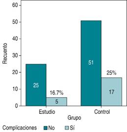 Se presentaron en el grupo control cinco complicaciones de 30 pacientes, lo que dio un 16.7%; en el grupo de estudio fueron 17 complicaciones de un total de 68 pacientes, lo que representó un 25% (Figura 1).