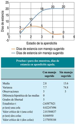 Se realizó estadística descriptiva de los datos demográficos, estadística analítica para comparar los grupos de apendicitis utilizando la t de Student en variables continuas para valorar la clasificación sugerida, con un intervalo de confianza de 95%, utilizando el sistema de análisis de datos de Excel. La probabilidad de < 0.05 fue aceptada como estadísticamente significativa.