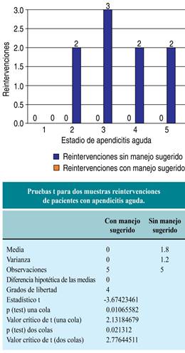 La clasificación sugerida muestra en este estudio que sí es posible homogeneizar las características de los hallazgos quirúrgicos, estadificarlos y nos da una pauta para decidir un manejo quirúrgico adecuado tomando en cuenta el estadio del apéndice, la cavidad peritoneal y las condiciones generales del paciente. Como se observa en las gráficas, la t de Student presenta un resultado estadístico significativo < 0.05, lo cual nos da la pauta para sugerir esta clasificación. En la Figura 1 podemos observar que la media de días de estancia en pacientes con manejo sugerido fue de 2.8 días comparado con 13.6 días en casos sin manejo sugerido y el resultado estadístico de p = 0.04 significativo. En la Figura 2 encontramos mayor tasa de complicaciones en los pacientes con estadios 2 sin manejo sugerido con una media de 6.8 comparada con 0.2 en los pacientes con manejo sugerido. Y en la Figura 3 observamos mayor tasa de reintervenciones en estadios 2, 3, 4 y 5 sin manejo sugerido con promedio 1.8 comparado con 0 en pacientes con manejo sugerido, con una p = de 0.02.