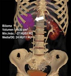 Figura 3: Reconstrucción VR3D con plataforma Syngo.vía de Siemens en la cual se cuantifica bilioma (flecha) con un volumen de 119.5 ml.