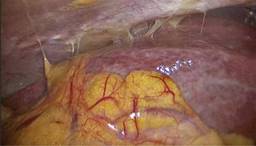 Se inició antibioticoterapia a base de carbapenémico e imidazol con posterior manejo quirúrgico. Se realizó colecistectomía más drenaje de absceso y colocación de drenajes por laparoscopia. Se colocaron cuatro trocares, en región umbilical y subxifoidea de 12 mm, en hipocondrio y flanco derecho de 5 mm, encontramos una vesicular biliar cubierta en su totalidad por epiplón correspondiente a Parkland 5 (Figura 4) con paredes adematosas y un absceso hepático en segmentos IV y V adherido a pared abdominal. Se drenaron aproximadamente 200 cm3 de material purulento (piocolecisto y absceso) (Figura 5), mismos que se mandaron a cultivar con reporte de crecimiento de Streptococcus anginosus y Enterobacter cloacae, se extrajo pieza con bolsa extractora y finalmente se colocaron drenajes cerrados de tipo Blake de 19 Fr a hiato de Winslow y a la cavidad del absceso, la paciente fue egresada a domicilio al cuarto día postoperatorio, se ajustó esquema antimicrobiano al egreso con ampicilina/sulbactam y metronidazol hasta completar 14 días totales de antibioticoterapia; en la consulta de seguimiento, al séptimo día postquirúrgico, la paciente se encontraba sin dolor en sitio quirúrgico, afebril, con buena tolerancia a la vía oral, con excretas al corriente. Se decide retirar ambos drenajes.
