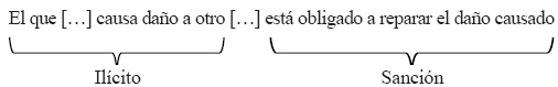 En primer lugar, de acuerdo con el esquema kelseniano, la sanción es un acto coactivo estatuido como reacción contra una acción u omisión (Kelsen, 1960, p. 123); y el acto ilícito es la condición que el derecho establece para que proceda jurídicamente la imposición de una sanción (Kelsen, 1960, p. 125). Siendo ello así, la obligación de reparar que dispone el artículo 1902 del cc no puede contar como una sanción, ya que no es un acto coactivo; no es la privación de ningún bien contra la voluntad del sujeto afectado por la norma. Si la responsabilidad no es una sanción, entonces, el acto (dañar) que genera responsabilidad no puede ser considerado ilícito por el hecho de generar responsabilidad, y su conducta contraria (no dañar) no puede ser entendida como un deber.