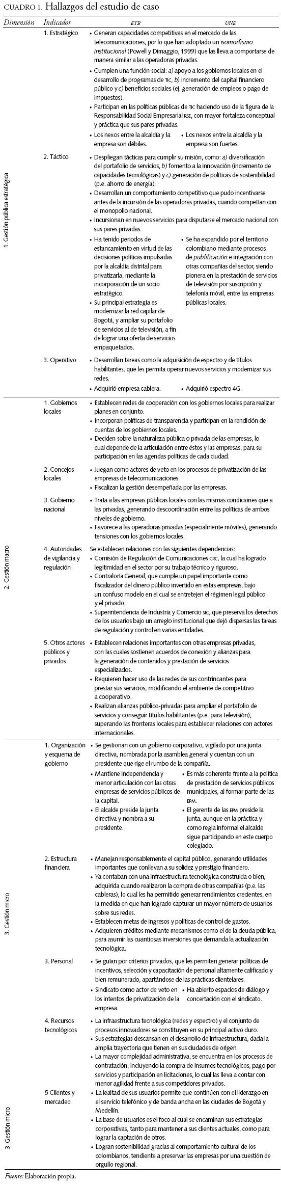 Con base en lo presentado en el cuadro 1, se concluye que en el ambiente de privatización del sector, ambas compañías han venido adaptando sus estructuras, al incorporar una especie de isomorfismo institucional, mediante el cual adoptan prácticas de gestión privada, para legitimar su existencia ante una ciudadanía cada vez más exigente, que demanda la prestación de servicios con eficiencia, calidad y diversidad. En ese contexto, ETB y UNE han aplicado diferentes estrategias corporativas, observándose el liderazgo de UNE, que como empresa pública impulsada por el orgullo regional de los antioqueños, se ha expandido por el territorio colombiano mediante procesos de publificación e integración con otras compañías del sector, siendo pionera en la prestación de servicios de televisión por suscripción y telefonía móvil, dentro de las empresas públicas locales. ETB por su parte, ha tenido periodos de estancamiento en virtud de las decisiones políticas impulsadas por la alcaldía distrital, para privatizarla mediante la incorporación de un socio estratégico.