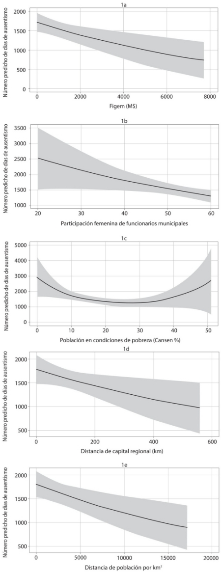 El eje y (vertical) representa el número de días (predicho o esperado según el modelo estadístico) de licencias médicas al año por municipio (ausentismo, variable dependiente). Por ejemplo, a medida que aumenta el porcentaje de mujeres del total de funcionarios (gráfica 1b), el ausentismo disminuiría.
