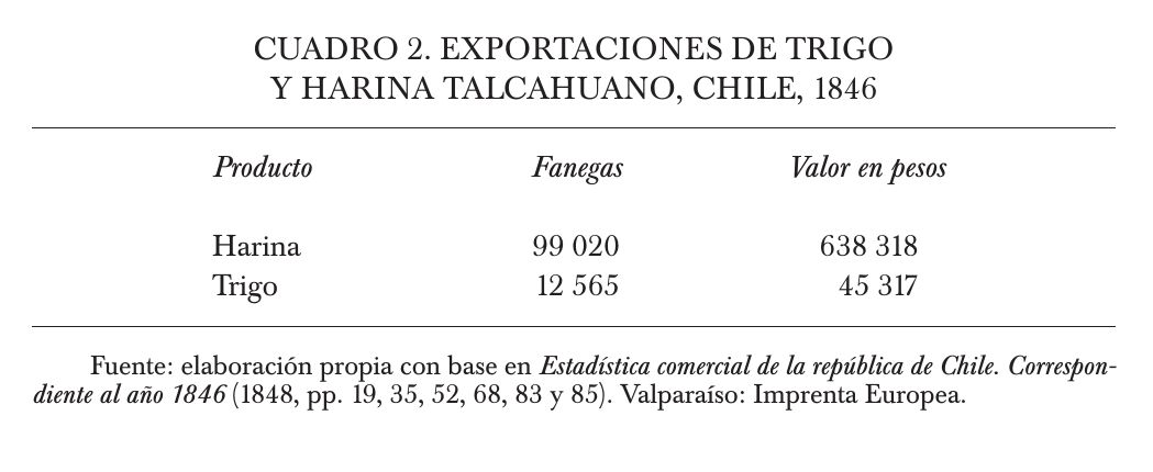 Los molinos industriales influyeron en la transformación de la economía regional, después de la independencia, sobre las exportaciones de trigo y de harinas por el puerto de Talcahuano en 1846 (véase cuadro 2). Estas cifras representan un testimonio claro de la transformación agroindustrial en Concepción y su economía provincial, orientada en este periodo a las exportaciones de harinas. Cabe aclarar que las cifras presentadas corresponden a una etapa previa al auge de la exportación al mercado de California, que se inició en 1849, y sobre todo en 1850.