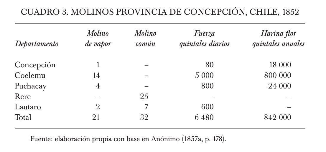 Asimismo, en 1846 el grano fue reemplazado por remesas de harinas elaboradas en la región con 99 020 fanegas por un valor de 638 318 pesos; estas cifras ilustran el impacto progresivo de la consolidación de la economía agroindustrial en la región de Concepción después de la independencia. Desde esta perspectiva agroindustrial debemos señalar el crecimiento ascendente de los molinos hacia 1852 (véase cuadro 3).