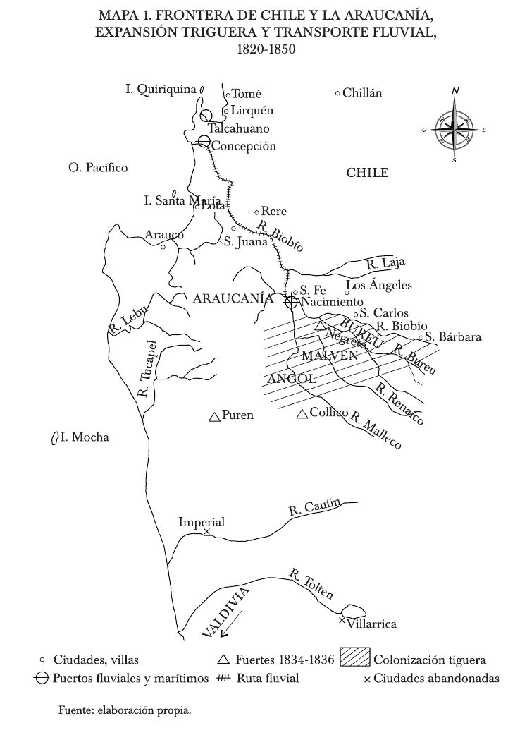 Esta ley ordenaba repoblar ciudades españolas de Angol, Imperial y Villarrica abandonadas hacia 1600, proponiendo avanzar la línea fronteriza unos 300 km al sur del río Biobío (véase mapa 1). La promulgación de la Ley de Colonización de 1823 permitió la celebración de un tratado de paz en 1825 con el cacique Francisco Mariluán, de la comarca fronteriza subandina de Malleco, limítrofe con el partido de La Laja de la ciudad de Los Ángeles (León, 2011, pp. 116-120; Téllez et al., 2011). En esta reunión se acordó dar continuidad a las actividades de los comerciantes criollos y la repoblación de los fuertes y villas de Nacimiento, Santa Bárbara, Santa Fe y Los Ángeles, verificada a fines de 1826.5
